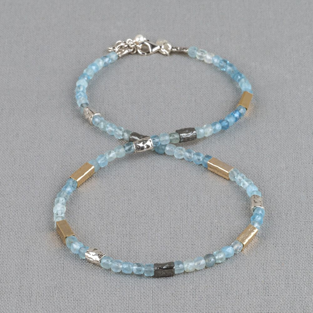 Armband van Jéh Jewels gemaakt van Aquamarijn met tussendoor zilver, oxy en goldfilled deeltjes. Aquamarijn heeft de kracht om anderen tolerant te maken, bestrijd de neiging te oordelen, biedt steun tijdens verantwoordelijkheden en helpt om op positieve wijze verantwoordelijk te zijn.