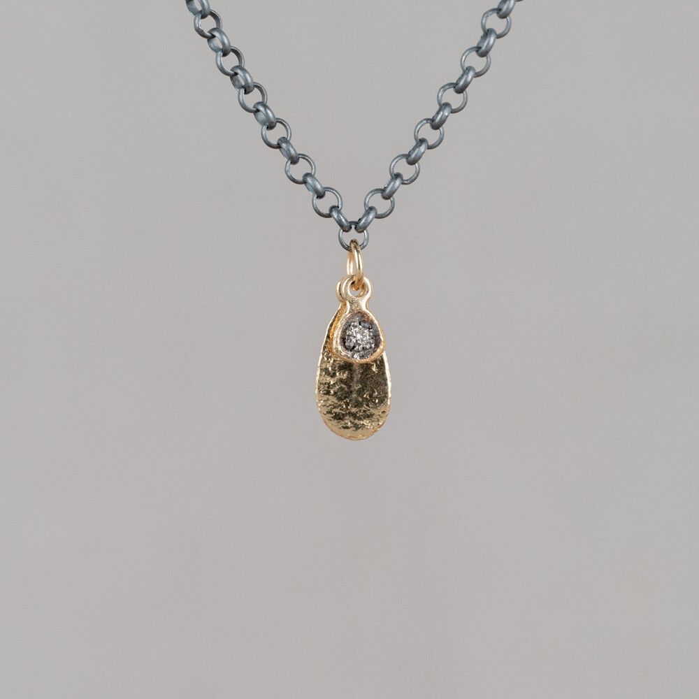Collier gemaakt van 925 geoxideerd sterling zilver, met daaraan kleine blaadjes van 14 karaat goud.
