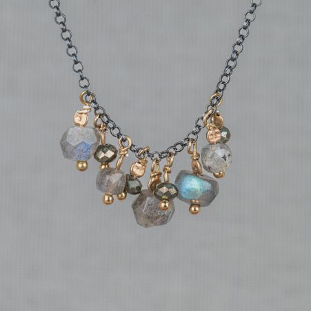 Collier gemaakt van geoxideerd zilver in combinatie met zilver vergulde trosjes met daaraan de edelstenen Labradoriet en Pyriet. Combineer met een mooie ring, armband en oorsieraden voor een complete look.