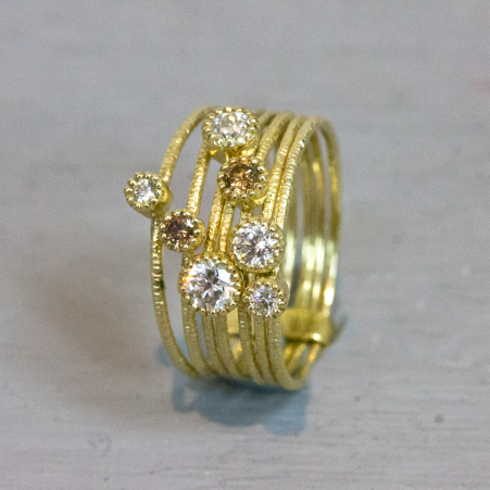 Ring bestaande uit zeven los verbonden ringen met ieder een diamant.